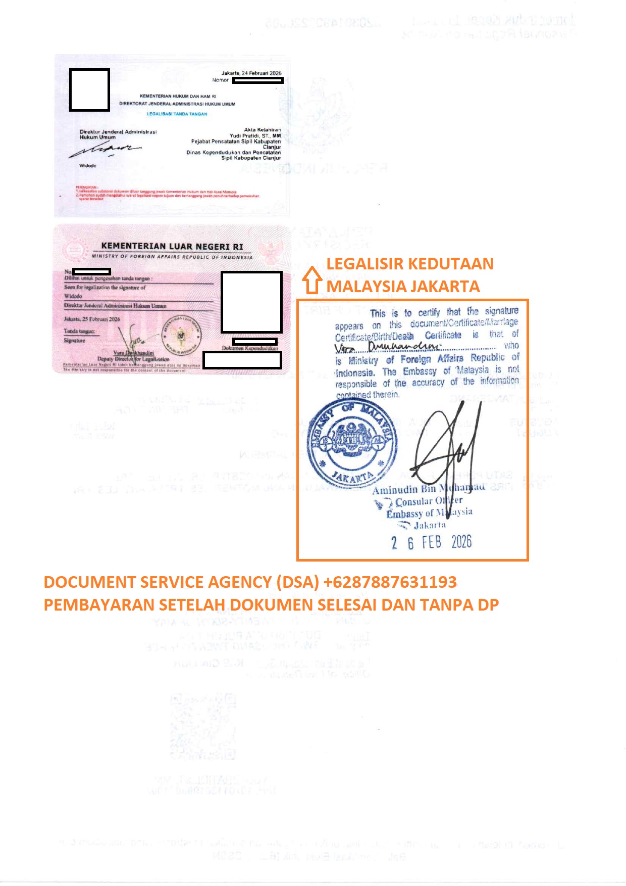 DSA (Document Service Agency) adalah spesialis jasa terjemah, legalisir, atestasi, apostile dokumen untuk keperluan di luar negeri dan pengurusan visa berpengalaman dan terpercaya. Bagi anda yang ingin melegalisir akta kelahiran di Kedutaan Malaysia untuk keperluan pengurusan visa, izin tinggal, pendaftaran pernikahan dan lain-lain. Anda tidak perlu datang ke Jakarta karna pengurusan dokumen anda bisa diwakilakan kepada kami, dengan layanan ” Pembayaran Setelah Dokumen Selesai dan Tanpa DP ” membuat anda lebih nyaman dan aman menggunakan jasa kami.