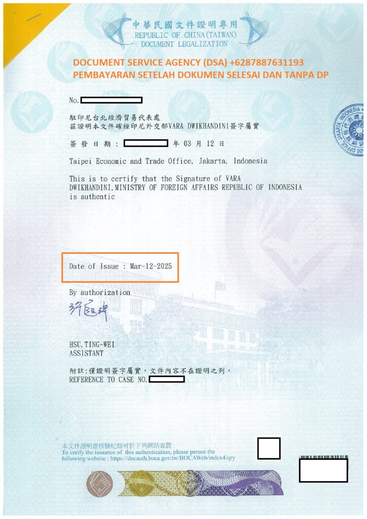DSA (Document Service Agency) adalah spesialis jasa terjemah, legalisir, atestasi, apostile dokumen untuk keperluan di luar negeri dan pengurusan visa berpengalaman dan terpercaya. Bagi anda yang ingin melegalisir akta kelahiran di Kedutaan Taiwan untuk study, keperluan bekerja, pengurusan visa, izin tinggal, dan lain-lain. Percayakan legalisir dokumen anda kepada kami, dengan layanan ” Pembayaran Setelah Dokumen Selesai dan Tanpa DP ” anda akan merasa lebih nyaman dan aman menggunakan jasa kami. Dan dalam hitungan beberapa hari dokumen anda selesai dan siap untuk digunakan.